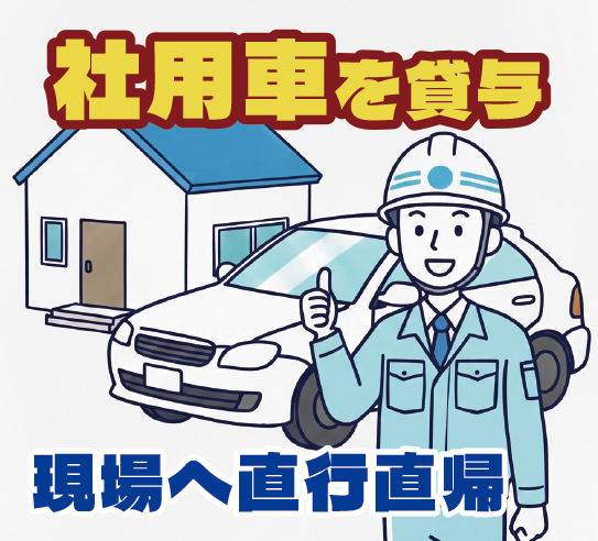 まず、建築現場はお住まいの近辺に限らず様々になります。そこで自家用車をお持ちで無い社員には社用車を貸与してお ります。